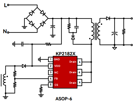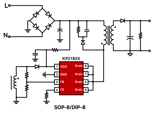 KP2182X 是一款高性能准谐振式原边控制功率开关,尤其适合于充电器应用。在满载输出条件下,KP2182X 在全部输入电压范围内均工作在准谐振模式,以此获得优异的效率和温升性能。 采用 KP2182X 可以工作无异音,同时可保证优异的动态性能。利用集成的线损补偿功能和线电压的恒流补偿功能,可获得高性能的恒压恒流输出表现。 KP2182X 集成有多种保护功能:VDD 欠压保护 (UVLO)、VDD 过压保护 (VDD OVP) 、逐周期限流保护 (OCP)、短路保护 (FB SLP) 、过压保护 (FB OVP) 、过热保护和 VDD 钳位等。 KP2182X 还集成有电源系统单点失效保护,在 FB 上拉电阻开路、FB 下拉电阻开路、FB 下拉电阻短路、输出二极管或者 SR 短路、变压器绕组短路、RCS 开路、IC GND 管脚开路等故障条件下均能可靠保护。 |